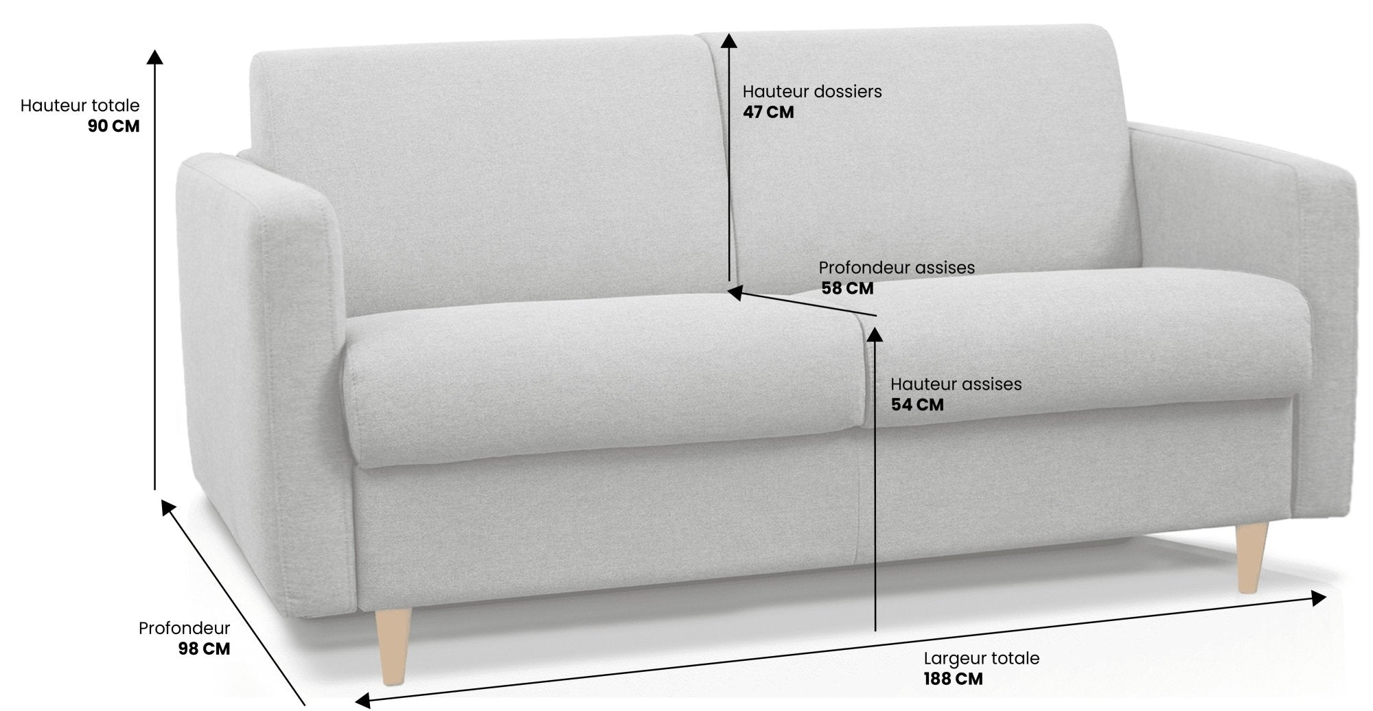 Pour le transformer en un lit confortable, vous n'aurez pas besoin de retirer ses coussins. Son mécanisme d'ouverture EXPRESS a été conçu pour vous faciliter la vie et durer dans le temps. En quelques secondes, votre canapé que personne ne soupçonne d'être un convertible se transforme en un vrai lit de 140cm.